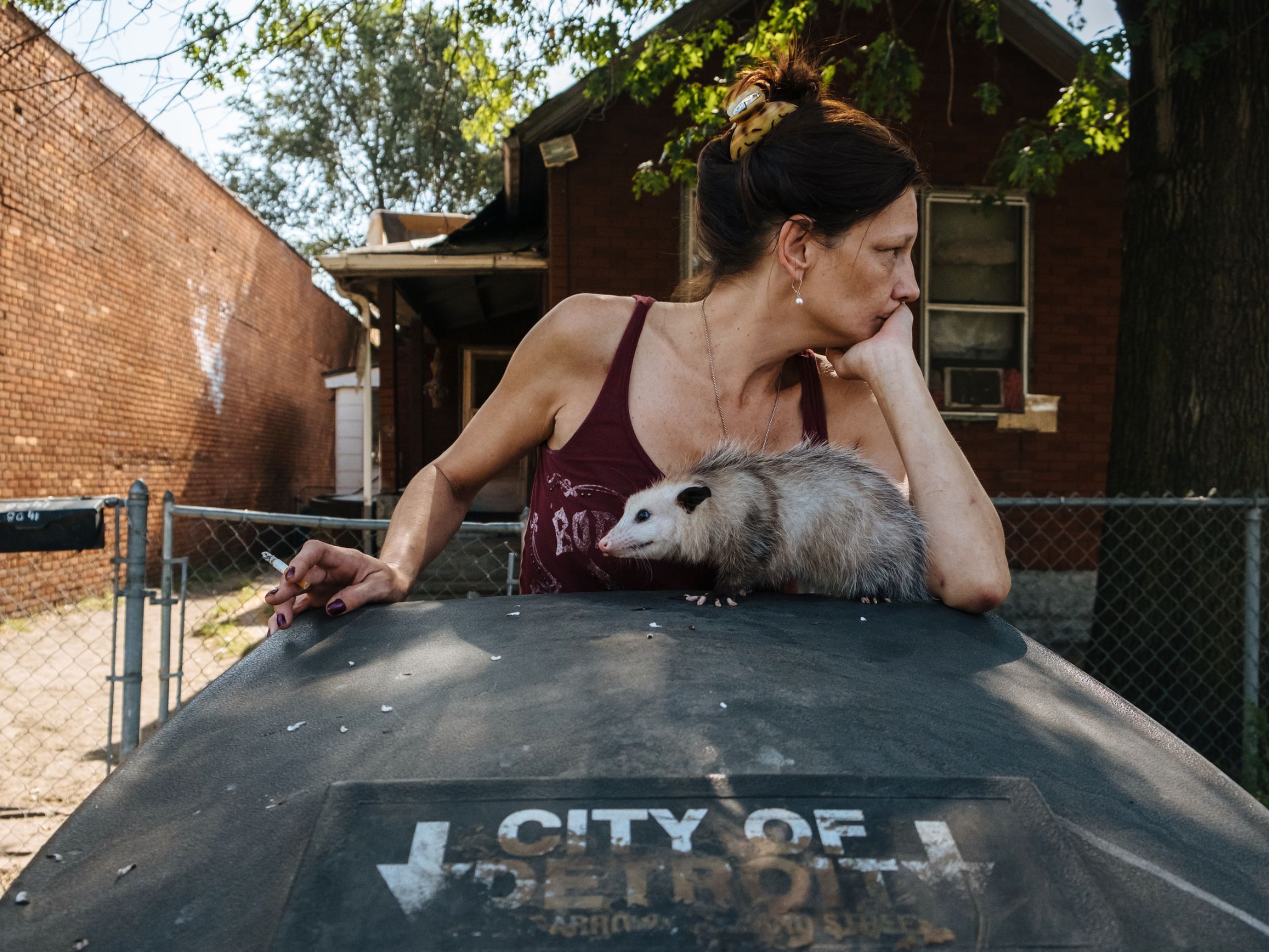 Fran McCracken, 50, takes a cigarette break as her pet opossum, which she named Samantha, sits atop a trash can in front of her home in Detroit’s Delray neighborhood on Sept. 25, 2017. “My neighborhood is nice,” she said. “It’s just peaceful down here. You go across the tracks, that’s when it gets bad. Yeah, you don’t want to go across the tracks when it’s nighttime. You find bodies — girls — all the time. Like the other day, my brother was driving down the street and they found a girl dead.”