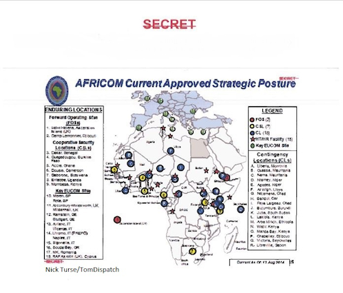 A map of US military bases—forward operating sites, cooperative security locations, and contingency locations—across the African continent in 2014, from declassified AFRICOM planning documents (Nick Turse / TomDispatch).