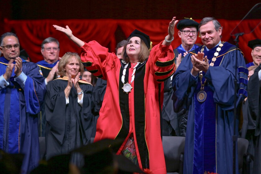 In one of academia’s oldest rituals, colorfully robed professors led Adela de la Torre onto a public stage Thursday at San Diego State University, where she was inaugurated president of a school that has grand dreams of building a large satellite campus a short distance away.