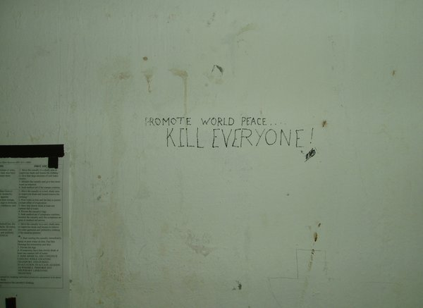 I took this photo of an interior wall of a gate guard tower at “Victory Base” in Baghdad in 2004. The graffiti is a classic example of the grim and cynical sense of humor soldiers cultivate in order to maintain their sanity in war. —Stephen Richey, U.S. Army, 1977-2010