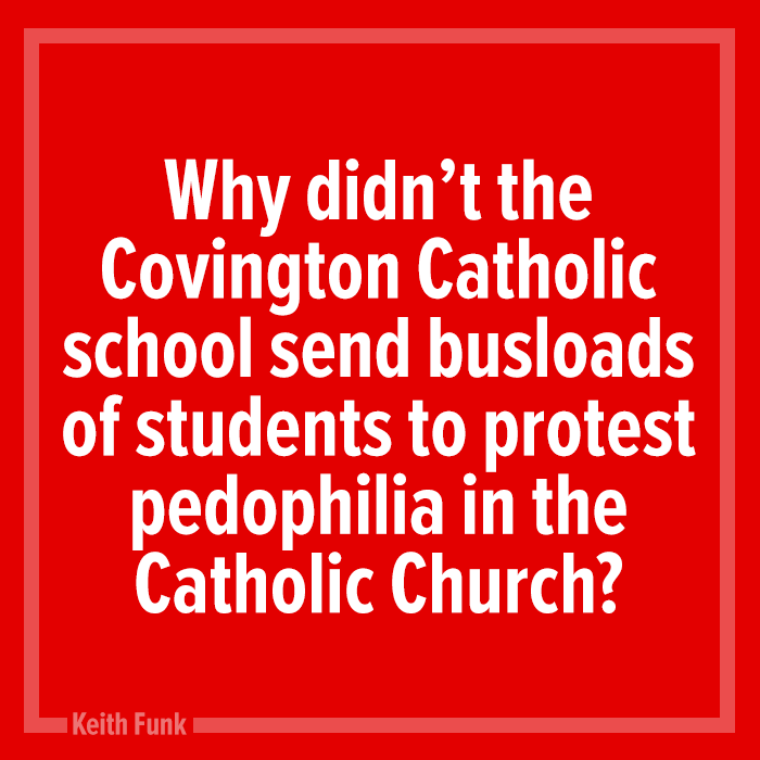 Schroder, wearing a white button-down shirt and a blue striped tie, said: “I just explain it as showing school spirit. We have many themes. Like nerd, business, whiteout, blueout, blackout—as you’ve seen in the video. Ever since I’ve gone to CovCath, we haven’t been able to wear black paint because of the video, but I know the kids meant nothing by it, it’s just showing school spirit.” www.thedailybeast.com/covington-catholic-teen-on-fox-and-friends-blackface-is-school-spirit?source=TDB&via=FB_Page&fbclid=IwAR01NimCsSm8v7eWHV_WKjOso-rlB24NTxmFj6ZEzfhKn6jMocAfiOn1xcY&fbclid=IwAR37QgD_gn90QDra4721rdLH_xRxB7oYiXWnzAjM-Kc6k50AcwUaR-Tu8tU